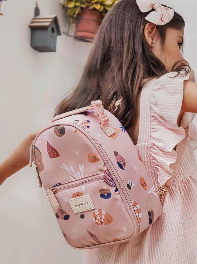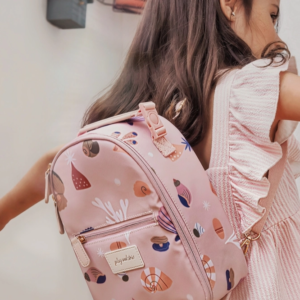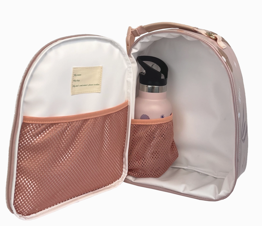 Met een handig voorvak voor snacks, een gaasvak voor een fles en een binnengaas voor bestek. Kan als rugzak, schoudertas of handtas worden gedragen. Voorzien van een handvat, een clip om los te maken en een label om de naam in te zetten.